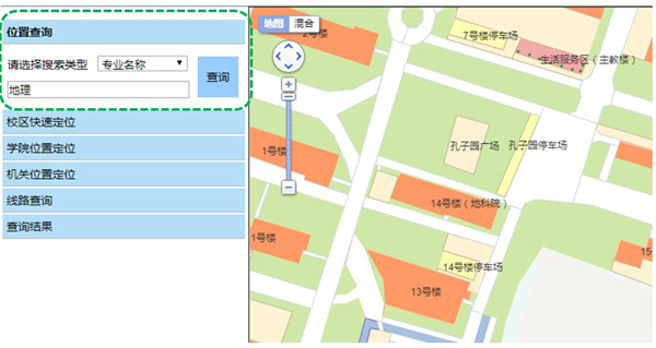 位置查询功能提供的查询类型主要包括:院系、专业、机构名称、报告厅(会场)、学生公寓、停车场、食堂、生活服务点和地物名称(地名)等。
