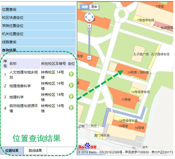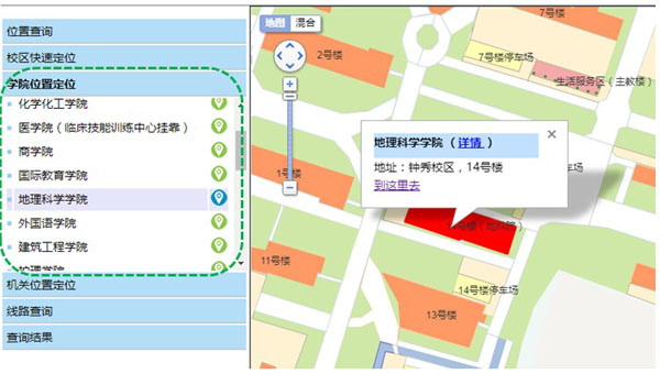 | 定位示例:在滚动列表中点击地理科学学院,右侧地图显示区会高亮显示该学院的位置。