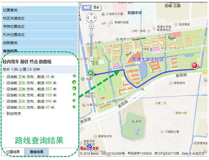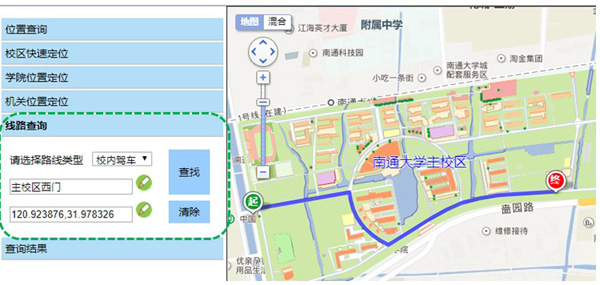 | 查询示例:路线类型选择驾车,起点输入南通站,终点输入主校区西门,点击查找后,系统会将结果显示在查询结果>位置结果面板中。